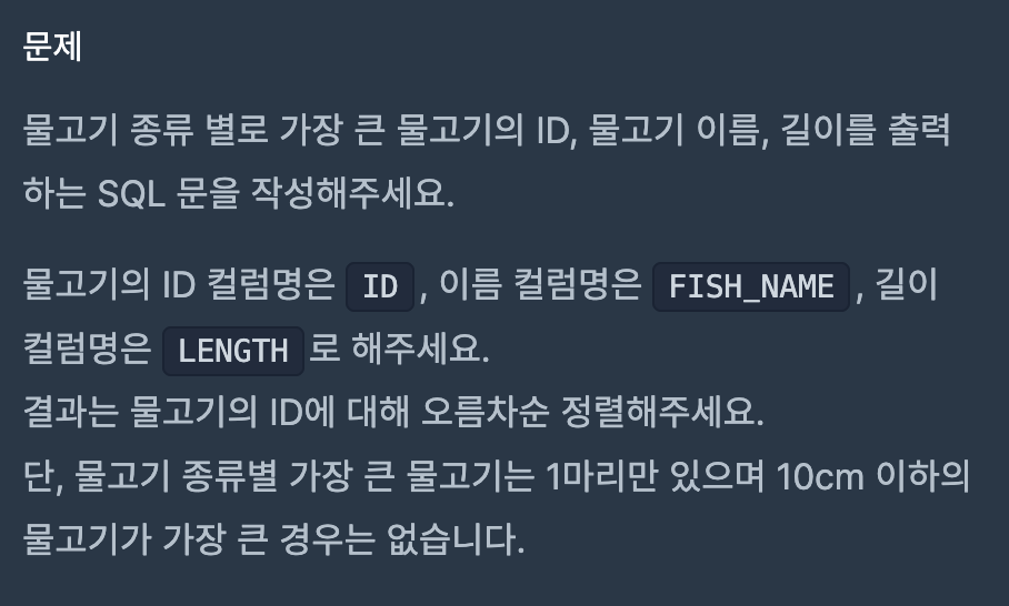 | 프로그래머스 - 잡은 물고기 중 가장 큰 물고기의 길이 구하기 (0) | 2025.02.24 |