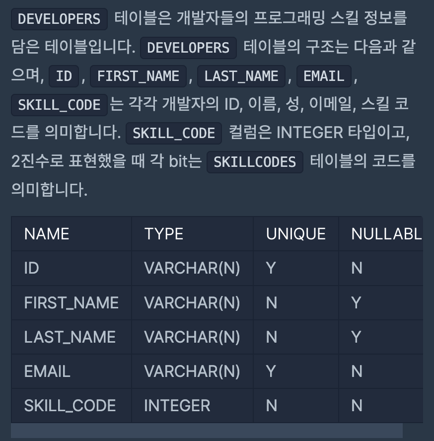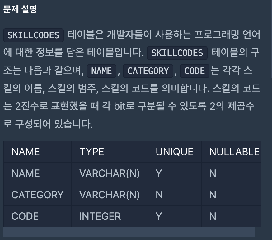 스킬 코드 값이 고정되어 있지 않기 때문에, Python, C#, Front End에 해당하는 코드 값을 SKILLCODES 테이블에서 동적으로 조회해 사용해야 한다.